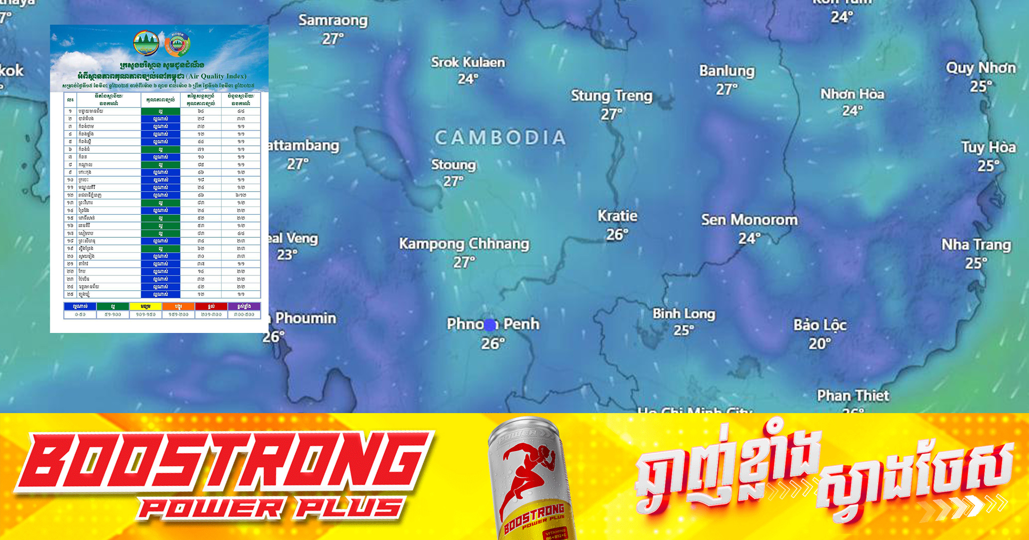 (ភ្នំពេញ)៖ ក្រសួងបរិស្ថានសូមជូនដំណឹងអំពីស្ថានភាពគុណភាពខ្យល់នៅក្នុងព្រះរាជាណាចក្រកម្ពុជា សម្រាប់ថ្ងៃទី១៥ ខែមីនា ឆ្នាំ២០២៥ ចាប់ពីម៉ោង ៦ល្ងាច ដល់ម៉ោង ៦ព្រឹកថ្ងៃទី១៦ ខែមីនា ឆ្នាំ២០២៥ ដែលមានកំហាប់ភាគល្អិតនិចលគិតជាមធ្យមស្មើនឹង២២.៨៦ µg/m3 ធៀបនឹងស្តង់ដារ ៥០ ug/m3 និងគិតជាសន្ទស្សន៍គុណភាពខ្យល់ (Air Quality Index) គឺ «ល្អណាស់»។ ពណ៌ខៀវៈ គុណភាពខ្យល់ល្អណាស់មានខេត្តកំពង់ឆ្នាំង ខេត្តព្រៃវែង ខេត្តកែប ខេត្តក្រចេះ ខេត្តមណ្ឌលគីរី ខេត្តត្បូងឃ្មុំ ខេត្តកំពត ខេត្តកំពង់ចាម ខេត្តស្វាយរៀង ខេត្តកោះកុង ខេត្តព្រះសីហនុ ខេត្តបាត់ដំបង ខេត្តកំពង់ស្ពឺ