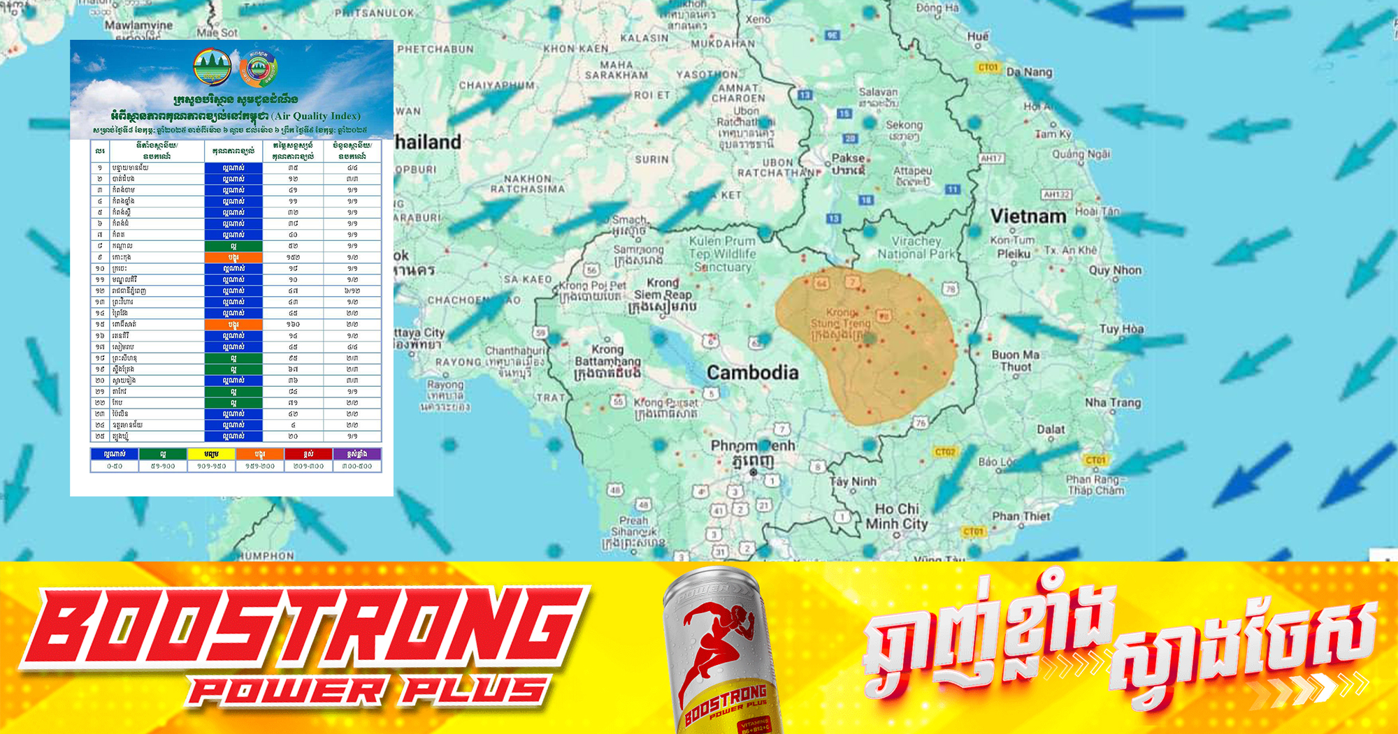 (ភ្នំពេញ)៖ ក្រសួងបរិស្ថាន ជូនដំណឹងអំពីស្ថានភាពគុណភាពខ្យល់នៅក្នុងព្រះរាជាណាចក្រកម្ពុជា សម្រាប់ថ្ងៃទី៨ ខែកុម្ភៈ ឆ្នាំ២០២៥ ចាប់ពីម៉ោង ៦ ល្ងាច ដល់ម៉ោង ៦ ព្រឹក ថ្ងៃទី៩ ខែកុម្ភៈ ឆ្នាំ២០២៥ ដែលមានកំហាប់ភាគល្អិតនិចលគិតជាមធ្យមស្មើនឹង ២៦.៧៩ µg/m3 ធៀបនឹងស្តង់ដា ៥០ ug/m3 និងគិតជាសន្ទស្សន៍គុណភាពខ្យល់ (Air Quality Index) គឺ «ល្អ»។ ពណ៌ខៀវៈ គុណភាពខ្យល់ល្អណាស់មានខេត្តបន្ទាយមានជ័យ ខេត្តបាត់ដំបង ខេត្តកំពង់ឆ្នាំង ខេត្តកំពង់ស្ពឺ ខេត្តកែប ខេត្តកំពត ខេត្តព្រៃវែង ខេត្តស្វាយរៀង