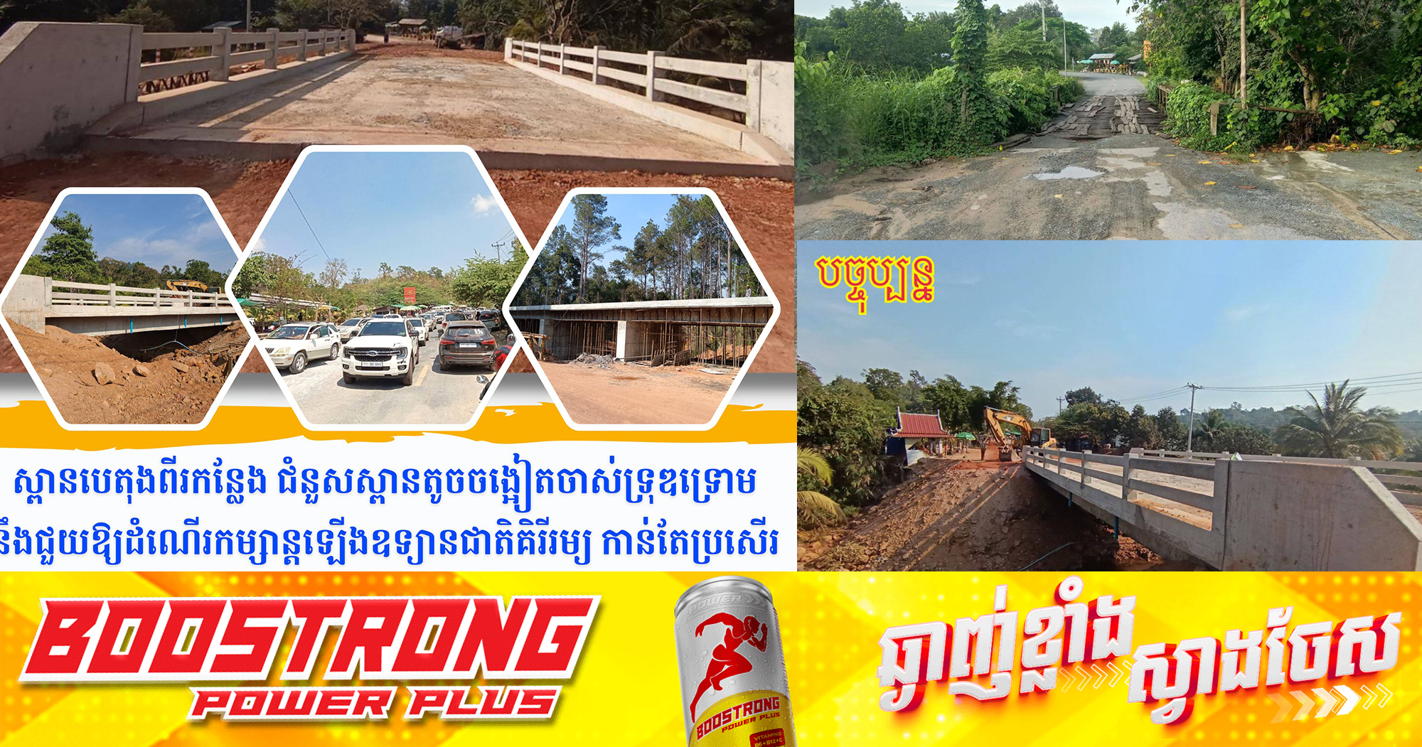 (ភ្នំពេញ)៖ បើគ្មានការប្រែប្រួលទេស្ពានបេតុងពីរកន្លែង ជំនួសស្ពានតូចចង្អៀតចាស់ទ្រុឌទ្រោម លើកំណាត់ផ្លូវជាតិលេខ៤៦ ដែលជាផ្លូវឡើងទៅឧទ្យានជាតិព្រះសុរាម្រិតកុសុមៈគិរីរម្យ(ឧទ្យានជាតិគិរីរម្យ)ស្ថិតនៅភូមិថ្មី ឃុំចំបក់ ស្រុកភ្នំស្រួច ខេត្តកំពង់ស្ពឺ នឹងបើកឱ្យប្រជាពលរដ្ឋបើកបរឆ្លងកាត់បណ្តោះអាសន្នក្នុងព្រឹត្តិការណ៍ «បុណ្យភ្នំ» នៅថ្ងៃទី១៥-១៦ ខែកុម្ភៈ ឆ្នាំ២០២៥ខាងមុខនេះ។ ថ្លែងប្រាប់បណ្តាញព័ត៌មាន នាថ្ងៃទី០៩ ខែកុម្ភៈ ឆ្នាំ២០២៥នេះ លោក ផន រឹម អ្នកនាំពាក្យ ក្រសួងសាធារណការ និងដឹកជញ្ជូន បានបញ្ជាក់ទៀត គម្រោងស្ថាបនាស្ពានបេតុង ២កន្លែងនេះ អនុវត្តដោយមន្ទីរសាធារណការ និងដឹកជញ្ជូនខេត្តកំពង់ស្ពឺនេះ រួមមាន៖ ស្ពានទី១ ប្រវែង១៨ម៉ែត្រ ទទឹង៩ម៉ែត្រ ត្រង់គ.ម១៤+១០០(ស្ពានអូរកសេះ) និងស្ពានទី២ ប្រវែង៣៦ម៉ែត្រ ទទឹង ៩ម៉ែត្រ