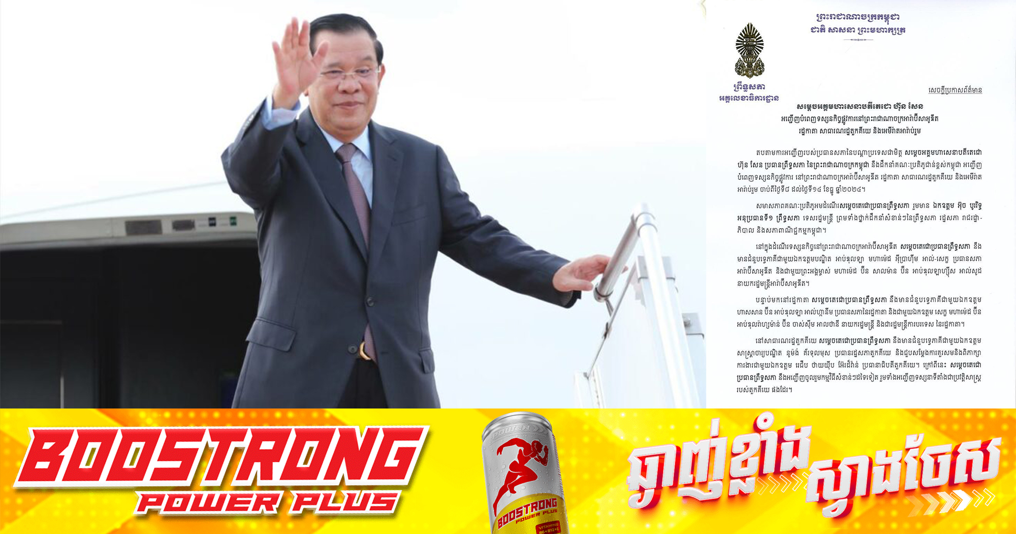 (ភ្នំពេញ)៖ នៅព្រឹកថ្ងៃទី៨ ខែធ្នូ ឆ្នាំ២០២៤នេះ សម្តេចអគ្គមហាសេនាបតីតេជោ ហ៊ុន សែន ប្រធានព្រឹទ្ធសភានៃព្រះរាជាណាចក្រកម្ពុជា ដឹកនាំគណៈប្រតិភូជាន់ខ្ពស់កម្ពុជា អញ្ជើញបំពេញទស្សនកិច្ចផ្លូវការ នៅព្រះរាជាណាចក្រអារ៉ាប៊ីសាអូឌីត រដ្ឋកាតា សាធារណរដ្ឋតួកគីយេ និងអេមីរ៉ាតអារ៉ាប់រួម សរុបរយៈពេល១សប្តាហ៍ ចាប់ពីថ្ងៃទី៨ ដល់ថ្ងៃទី១៤ ខែធ្នូ ឆ្នាំ២០២៤។ ការអញ្ជើញបំពេញទស្សនកិច្ចផ្លូវការនេះ ធ្វើឡើងតបតាមការអញ្ជើញរបស់ប្រធានសភានៃបណ្តាប្រទេសជាមិត្ត។ សមាសភាពគណៈប្រតិភូអមដំណើរ សម្តេចតេជោប្រធានព្រឹទ្ធសភា រួមមានលោក អ៊ុច បូររិទ្ធ អនុប្រធានទី១ ព្រឹទ្ធសភា ព្រមទាំងថ្នាក់ដឹកនាំសំខាន់ៗនៃព្រឹទ្ធសភា រដ្ឋសភា រាជរដ្ឋាភិបាល និងសភាពាណិជ្ជកម្មកម្ពុជា។ នៅក្នុងដំណើរទស្សនកិច្ច នៅព្រះរាជាណាចក្រអារ៉ាប៊ីសាអូឌីត សម្តេចតេជោប្រធានព្រឹទ្ធសភា