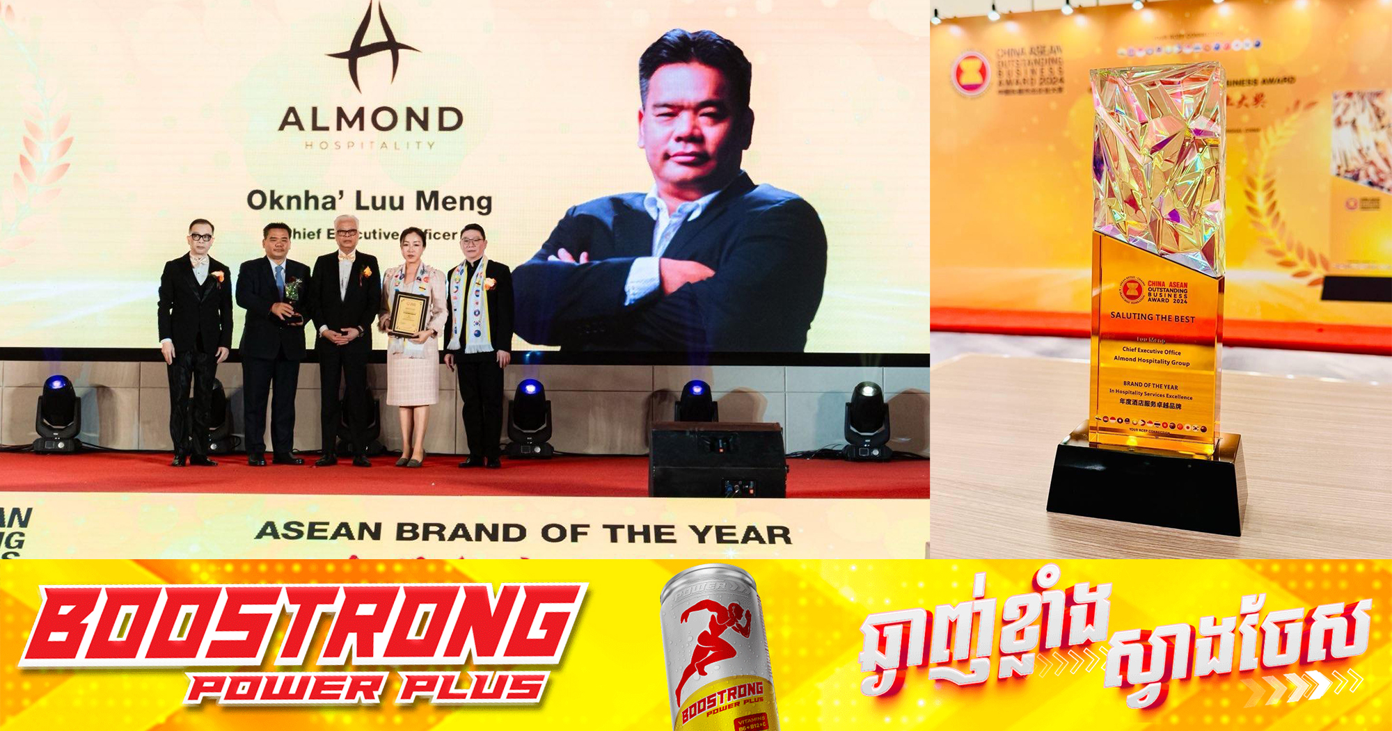 (សៀងហៃ)៖ ពិតជាមានមោទនភាពណាស់សម្រាប់កម្ពុជា! លោក លូ ម៉េង មេចុងភៅឆ្នើម ដែលមានភាពល្បីល្បាញក្នុងវិស័យម្ហូបអាហារនៅកម្ពុជា ហើយក៏ជានាយកប្រតិបត្តិនៃ ក្រុមហ៊ុន បដិសណ្ឋារកិច្ច អល មិន បានទទួលពានរង្វាន់លំដាប់អន្តរជាតិថ្មីមួយទៀត នោះគឺ ពានរង្វាន់ «ឧត្តមភាពនៃម៉ាកយីហោប្រចាំឆ្នាំក្នុងវិស័យសេវាកម្មបដិសណ្ឋារកិច្ច» នៅក្នុងកម្មវិធី «ពានរង្វាន់ មុខជំនួញឈានមុខគេ ប្រចាំតំបន់អាស៊ាន-ចិន ឆ្នាំ២០២៤»។ ពិធីនេះបានប្រព្រឹត្ដទៅនៅថ្ងៃទី០៧ ខែធ្នូ ឆ្នាំ២០២៤ ដែលប្រារព្ធឡើងនៅក្នុងទីក្រុងសៀងហៃ ប្រទេសចិន ដែលមានការអញ្ជើញចូលរួមពីភ្ញៀវកិត្ដិយសជាច្រើនរូបផងដែរ។ លោក លូម៉េង នាយកប្រតិបត្តិនៃ ក្រុមហ៊ុន បដិសណ្ឋារកិច្ច អល មិន បានថ្លែងអំណរគុណដល់អតិថិជនទាំងអស់ សហគ្រាស