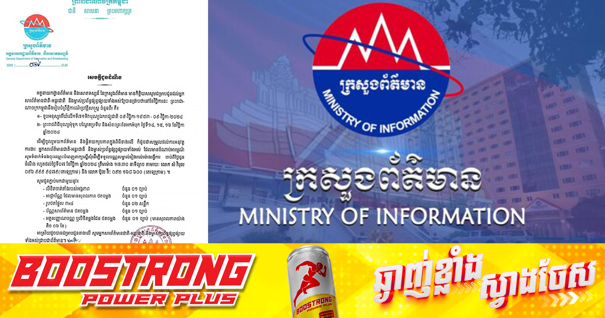 (ភ្នំពេញ)៖ អគ្គនាកដ្ឋានព័ត៌មាន និងសោតទស្សន៍ នៃក្រសួងព័ត៌មាន បានជូនដំណឹងដល់អ្នកសារព័ត៌មានជាតិ-អន្តរជាតិ និងម្ចាស់ប្រព័ន្ធផ្សព្វផ្សាយទាំងអស់ឱ្យបានជ្រាបថានៅខែវិច្ឆិកានេះ ព្រះរាជាណាចក្រកម្ពុជានឹងរៀបចំព្រឹត្តិការណ៍ប្រវត្តិសាស្ត្រចំនួនពីរ គឺទី១៖ ខួបអនុស្សាវរីយ៍លើកទី៧១ ទិវាបុណ្យឯករាជ្យជាតិ ០៩-វិច្ឆិកា-១៩៥៣ – ០៩-វិច្ឆិកា-២០២៤ និង២៖ ព្រះរាជពិធីបុណ្យអុំទូក បណ្ដែតប្រទីប និងសំពះព្រះខែអកអំបុក ថ្ងៃទី១៤, ១៥, ១៦ ខែវិច្ឆិកា ឆ្នាំ២០២៤។ តាមរយៈសេចក្តីជូនដំណឹងដែលបណ្តាញព័ត៌មាន Fresh News ទទួលបាននៅថ្ងៃទី០៣ ខែវិច្ឆិកា ឆ្នាំ២០២៤នេះ អគ្គនាកដ្ឋានព័ត៌មាន និងសោតទស្សន៍ នៃក្រសួងព័ត៌មាន បានឱ្យដឹងថា ដើម្បីចូលរួមយកព័ត៌មាន និងផ្តិតយករូបភាពក្នុងពិធីខាងលើ ក៏ដូចជាសម្រួលដល់ការអនុវត្តការងារ