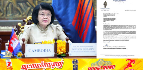 (ភ្នំពេញ)៖ សម្តេចមហារដ្ឋសភាធិការធិបតី ឃួន សុដារី ប្រធានរដ្ឋសភាកម្ពុជា បានផ្ញើលិខិតរួមមួយជូនទៅ ប្រធានរដ្ឋសភាវៀតណាម និងប្រធានរដ្ឋសភាឡាវ ដើម្បីបញ្ចប់កិច្ចសហប្រតិបត្តិការក្រោមក្របខណ្ឌតំបន់ត្រីកោណអភិវឌ្ឍន៍កម្ពុជា-ឡាវ-វៀតណាម ចាប់ពីថ្ងៃទី២១ ខែកញ្ញា ឆ្នាំ២០២៤នេះតទៅ។ ក្នុងសារលិខិតសម្តេចរដ្ឋសភាធិបតី ឃួន សុដារី ផ្ញោះជូន លោកបណ្ឌិត សាយសំផន ភូមិវិហាន (Xaysomphone Phomvihane) ប្រធានរដ្ឋសភានៃសាធារណរដ្ឋប្រជាធិបតេយ្យប្រជាមានិតឡាវ និង លោក ជិន ថាញ់មិន (Tran Thanh Man) ប្រធានរដ្ឋសភានៃសាធារណរដ្ឋសង្គមនិយមវៀតណាម រដ្ឋធានីហាណូយ បានឱ្យដឹងថា៖ «យោងតាមសេចក្តីសម្រេចរបស់រាជរដ្ឋាភិបាលកម្ពុជា ថ្ងៃទី២០ ខែកញ្ញា ឆ្នាំ២០២៤ ស្តីពីការបញ្ចប់ការចូលរួមតំបន់ត្រីកោណអភិវឌ្ឍន៍កម្ពុជា-ឡាវ-វៀតណាម (CLV-DTA) រដ្ឋសភានៃព្រះរាជាណាចក្រកម្ពុជាមានកិត្តិយសសូមជម្រាប ជូន ឯកឧត្តមប្រធានទាំងពីរ មេត្តាជ្រាបថា រដ្ឋសភានៃព្រះរាជាណាចក្រកម្ពុជា សូមបញ្ចប់កិច្ចសហប្រតិបត្តិការក្រោម ក្របខណ្ឌតំបន់ត្រីកោណអភិវឌ្ឍន៍កម្ពុជា-ឡាវ-វៀតណាម ចាប់ពីថ្ងៃទី២១ ខែកញ្ញា ឆ្នាំ២០២៤ នេះតទៅ»។ ឆ្លៀតក្នុងឱកាសនេះ សម្តេចបានសម្តែងនូវអំណរគុណយ៉ាងជ្រាលជ្រៅ ជូនចំពោះរដ្ឋសភាឡាវ និងរដ្ឋសភាវៀតណាម ចំពោះកិច្ចខិតខំប្រឹងប្រែង និងការយកចិត្តទុកដាក់ខ្ពស់ ក្នុងការពង្រឹងកិច្ចសហប្រតិបត្តិការសភា ក្រោមក្របខណ្ឌតំបន់ត្រីកោណអភិវឌ្ឍន៍កម្ពុជា-ឡាវ-វៀតណាម […]