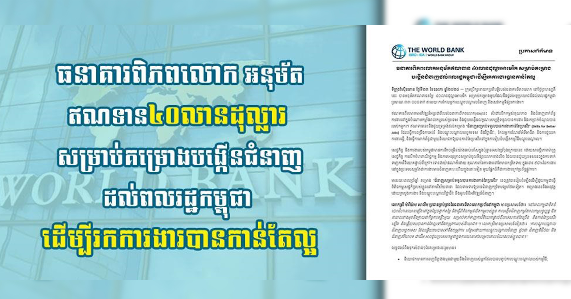 (ភ្នំពេញ)៖ ក្រុមប្រឹក្សានាយកប្រតិបត្តិរបស់ធនាគារពិភពលោក បានអនុម័តឥណទានតម្លៃ ៤០លានដុល្លារអាមេរិក សម្រាប់គម្រោងមួយ ដែលនឹងផ្តល់អត្ថប្រយោជន៍ដល់ពលរដ្ឋកម្ពុជា ប្រមាណ៣៣ ០០០នាក់ តាមរយៈការកែលម្អការបណ្តុះបណ្តាលជំនាញ និងសេវាកម្មទីផ្សារការងារ។ នេះបើតាមសេចក្ដីប្រកាសព័ត៌មាន ដែលបណ្ដាញព័ត៌មាន Fresh News ទទួលបាននៅថ្ងៃទី២៤ ខែឧសភា ឆ្នាំ២០២៤។ ឥណទានពីសមាគមអភិវឌ្ឍន៍អន្តរជាតិរបស់ធនាគារពិភពលោក(IDA)នេះ សំដៅលើកកម្ពស់គុណភាព និងជំនាញពាក់ព័ន្ធការងារនៅក្នុងចំណោមកម្លាំងពលកម្មរបស់ប្រទេស និងជួយបង្កើនលក្ខណៈសម្បត្តិទទួលបានការងារ និងរកប្រាក់ចំណូលបានរបស់កម្មករ។ ឥណទាននេះ នឹងជួយទ្រទ្រង់ដល់គម្រោង «ជំនាញសម្រាប់ទទួលបានការងារកាន់តែប្រសើរ» (Skills for Better Jobs) ដែលធ្វើការពង្រឹងការអប់រំ និងបណ្តុះបណ្តាលបច្ចេកទេស និងវិជ្ជាជីវៈ, កែលម្អការណែនាំអំពីអាជីព និងការជួយរកការងារធ្វើ, និងធ្វើការពាក់ព័ន្ធជាមួយនិយោជក ឲ្យបានកាន់តែប្រសើរនៅក្នុងការរៀបចំបង្កើតកម្មវិធីបណ្តុះបណ្តាល។ សេដ្ឋកិច្ច និងការងាររបស់កម្ពុជាមានការរីកចម្រើនយ៉ាងឆាប់រហ័សក្នុងប៉ុន្មានទសវត្សរ៍ចុងក្រោយនេះ ដោយសារស្ថិរភាពម៉ាក្រូសេដ្ឋកិច្ច ការបើកចំហពាណិជ្ជកម្ម និងភាពអនុគ្រោះសម្រាប់ចូលទីផ្សារលោកខាងលិច ដែលបានជួយប្រទេសនេះក្នុងការទាក់ទាញការវិនិយោគផ្ទាល់ពីក្រៅ។ ទោះជាយ៉ាងណាក៏ដោយ គុណភាពនៃការងារនៅតែមានកម្រិតទាប ក្នុងនោះ ៩៨%នៃការងារនៅក្នុងប្រទេសសុទ្ធតែជាការងារមានជំនាញទាប ហើយក្នុងនោះទៀត មួយផ្នែកធំគឺជាការងារក្រៅប្រព័ន្ធផ្លូវការ។ មានរយៈពេលប្រាំឆ្នាំ គម្រោង «ជំនាញសម្រាប់ទទួលបានការងារកាន់តែប្រសើរ» នេះត្រូវបានរៀបចំឡើងដើម្បីជួយកម្ពុជា ធ្វើពិពិធកម្មសេដ្ឋកិច្ចរបស់ខ្លួននៅតាមវិស័យនានា ដែលទាមទារឲ្យមានជំនាញកម្រិតមធ្យមថែមទៀត។ គម្រោងនេះ […]