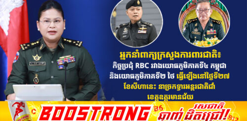 អ្នកនាំពាក្យក្រសួងការពារជាតិកម្ពុជា៖ កិច្ចប្រជុំ RBC រវាងយោធភូមិភាគទី៤ កម្ពុជា និងយោធភូមិភាគទី២ ថៃ ធ្វើឡើងនៅថ្ងៃទី២៧ ខែសីហានេះ នាច្រកទ្វារអន្ដរជាតិជាំ ខេត្តឧត្តរមានជ័យ