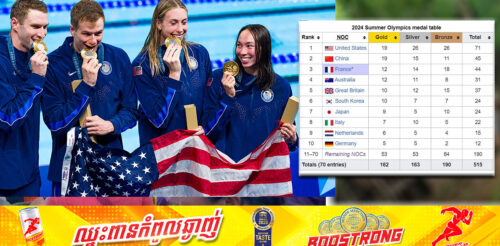 (បារីស)៖ គិតត្រឹមថ្ងៃទី០៥ ខែសីហានេះ ក្រុមអត្តពលិកអាមេរិក បានឡើងឈរកំពូលតារាងមេដាយនៃព្រឹត្តិការណ៍កីឡាអូឡាំពិក Paris Olympics Games 2024 ដោយមានមេដាយមាសស្មើគ្នាជាមួយក្រុមអត្តពលិកចិន ១៩គ្រឿង ខណៈម្ចាស់ផ្ទះបារាំង ឈរលេខ៣ មានមេដាយមាស ១២គ្រឿងសរុប ៤៤គ្រឿងជាបណ្តោះអាសន្ន ។ ក្រុមអត្តពលិកអាមេរិន បានឡើងឈរនាំមុខកំពូលតារាងមេដាយក្រោយរកបានមេដាយមាស ១៩គ្រឿង ប្រាក់ និងសំរឹទ្ធ ២៦គ្រឿងស្មើគ្នា ដោយសរុប ៧១គ្រឿង ដ្បិតក្រុមចិន មានមេដាយមាស ១៩គ្រឿង តែមានមេដាយប្រាក់តែ ១៥គ្រឿង ជាមួយមេដាយសំរឹទ្ធ ១១គ្រឿងសរុប ៤៥គ្រឿង ។ ក្នុងនោះក្រុមអូស្រ្តាលី ឈរលេខ៤ រកបានមេដាយសរុប ៣១គ្រឿង ជាមួយមេដាយមាស ១២គ្រឿង ប្រាក់ ១១ និងសំរឹទ្ធ៨ ហើយក្រុមអង់គ្លេស រកបានមេដាយមាស ១០គ្រឿង ប្រាក់ ១២ និងសំរឹទ្ទ ១៥គ្រឿងសរុប ៣៧គ្រឿង ដ្បិតការប្រកួតនិងបិទបញ្ចប់នៅថ្ងៃទី១១ ខែសីហានេះ ៕ ផ្ដល់សិទ្ធិដោយ៖ Fresh […]