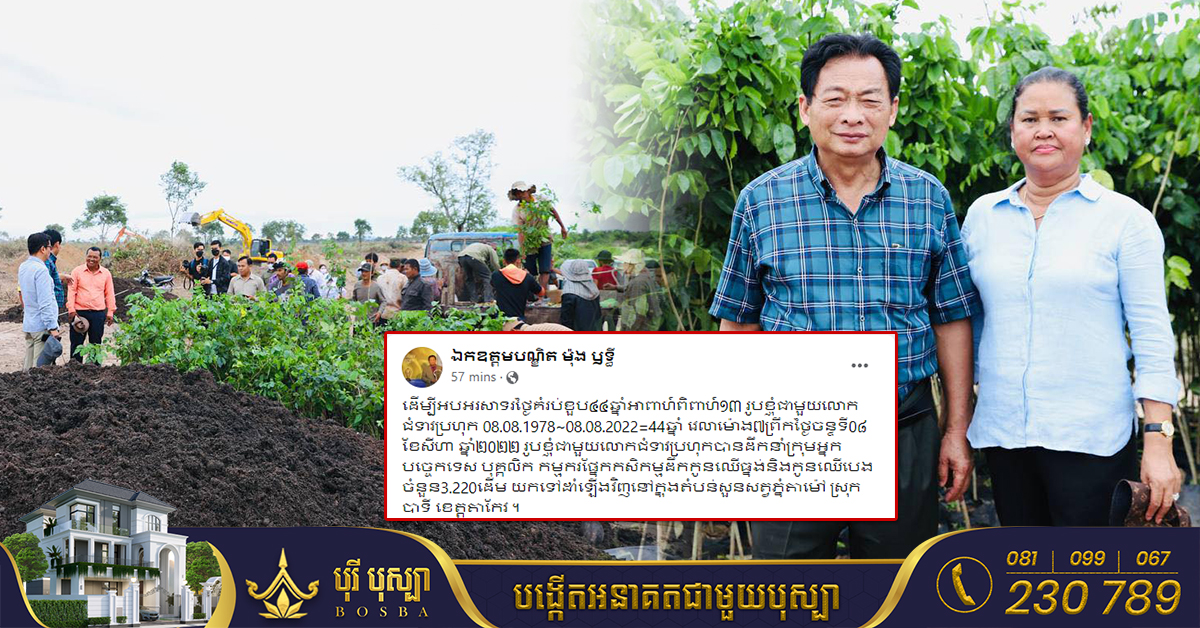 យោងតាមគណនីហ្វេសប៊ុកផ្ទាល់របស់ ឧកញ៉ា ម៉ុង ឫទ្ធី ដែលមហាជនស្គាល់ថាជាសេដ្ឋីកសិកម្មនៅកម្ពុជា នៅថ្ងៃទី០៨ ខែសីហា ឆ្នាំ២០២២នេះ ជាថ្ងៃគម្រប់ខួប ៤៤ឆ្នាំអាពាហ៍ពិពាហ៍១៣ របស់ឧកញ៉ា ម៉ុង ឫទ្ធី ជាមួយលោកជំទាវ បានដឹកនាំក្រុមអ្នកបច្ចេកទេស បុគ្គលិក កម្មករផ្នែកកសិកម្មដឹកកូនឈើធ្នង់និងកូនឈើបេងចំនួន៣,២២០ដើម យកទៅដាំឡើងវិញនៅក្នុងតំបន់សួនសត្វភ្នំតាម៉ៅ ស្រុកបាទី ខេត្តតាកែវ។ នៅក្នុងគណនីហ្វេសប៊ុកផ្ទាល់របស់ ឧកញ៉ា ម៉ុង ឫទ្ធី បានរៀបរ៉ាប់យ៉ាងដូច្នេះថា៖ ដើម្បីអបអរសាទរថ្ងៃគម្រប់ខួប៤៤ឆ្នាំអាពាហ៍ពិពាហ៍១៣ រូបខ្ញុំជាមួយលោកជំទាវប្រហុក08.08.1978~08.08.2022=44ឆ្នាំ វេលាម៉ោង ៧ព្រឹក ថ្ងៃចន្ទ ទី០៨ ខែសីហា ឆ្នាំ២០២២ រូបខ្ញុំជាមួយលោកជំទាវប្រហុកបានដឹកនាំក្រុមអ្នកបច្ចេកទេស បុគ្គលិក កម្មករផ្នែកកសិកម្មដឹកកូនឈើធ្នង់និងកូនឈើបេងចំនួន 3.220ដើម យកទៅដាំឡើងវិញនៅក្នុងតំបន់សួនសត្វភ្នំតាម៉ៅ ស្រុកបាទី ខេត្តតាកែវ។ ឧកញ៉ា ម៉ុង ឫទ្ធី បានបន្ថែមថា៖ ឈ្លៀតឱកាសនេះខ្ញុំសូមអរគុណច្រើនខ្លាំងណាស់ ដល់ក្រុមចុងភៅចល័ត សេង ហុកហេង ដែលបានជួយផ្តល់អាហារថ្ងៃត្រង់ចំនួន ៣០០កញ្ចប់ រួមជាមួយទឹកបរិសុទ្ធចំនួន១០០កេះ និងសូមអរព្រះគុណ អរគុណដល់ ព្រះសង្ឃ សិក្សានុសិស្ស […]