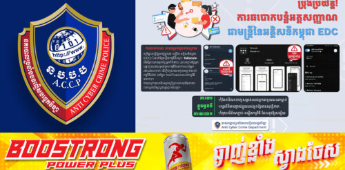 សូមបងប្អូនប្រុងប្រយ័ត្ន! នគរបាលប្រឆាំងបទល្មើសបច្ចេកវិទ្យា អំពាវនាវប្រជាពលរដ្ឋកុំចាញ់ការឆ/បោកបន្លំអត្តសញ្ញាណជាមន្ត្រីអគ្គិសនីកម្ពុជា (EDC) ស្នើឱ្យដំឡើងកម្មវិធីទូរស័ព្ទ