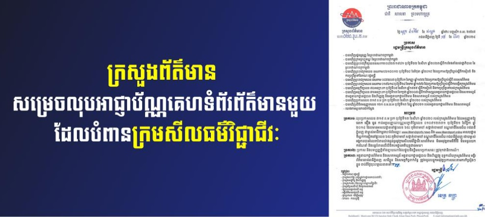 ក្រសួងព័ត៌មាន សម្រេចលុបអាជ្ញាប័ណ្ណគេហទំព័រព័ត៌មានមួយ ដែលបំពានក្រមសីលធម៌វិជ្ជាជីវៈ