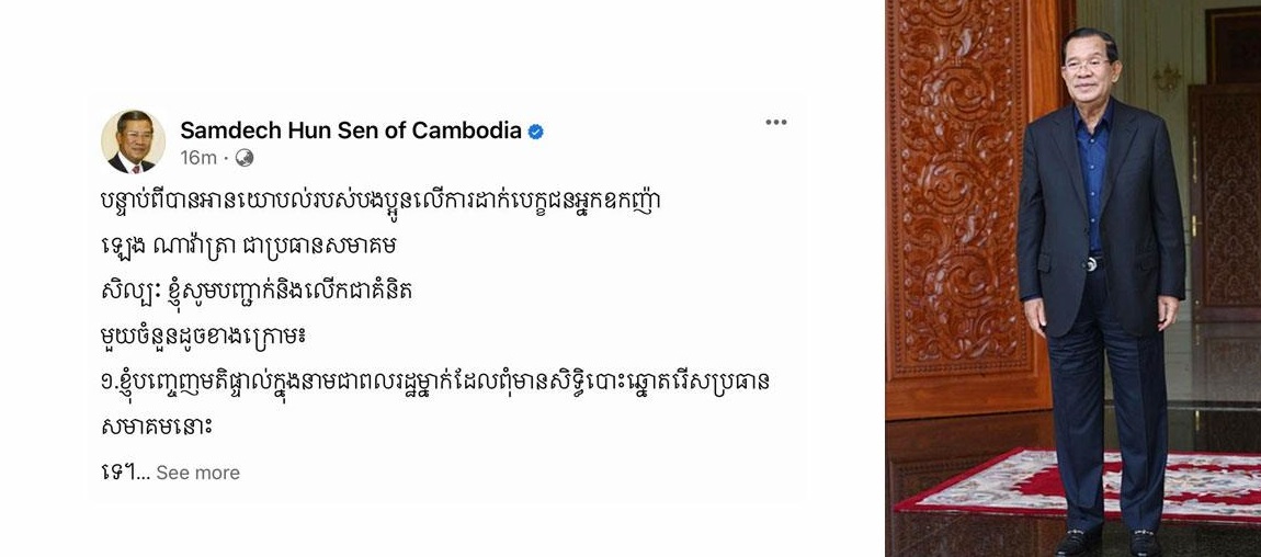 សម្តេចតេជោ ហ៊ុន សែន បញ្ជាក់បន្ថែមលើបេក្ខភាព ប្រធានសមាគមសិល្បៈ និងស្នើអ្នកឧកញ៉ា ឡេង ណាវ៉ាត្រា ដកបេក្ខភាពចេញសិន ទុកលទ្ធភាពឱ្យ ឬមួយអ្នកនាងចន ច័ន្ធលក្ខិណា បន្ត ឬមួយរកបេក្ខភាពផ្សេងធ្វើប្រធានសមាគម