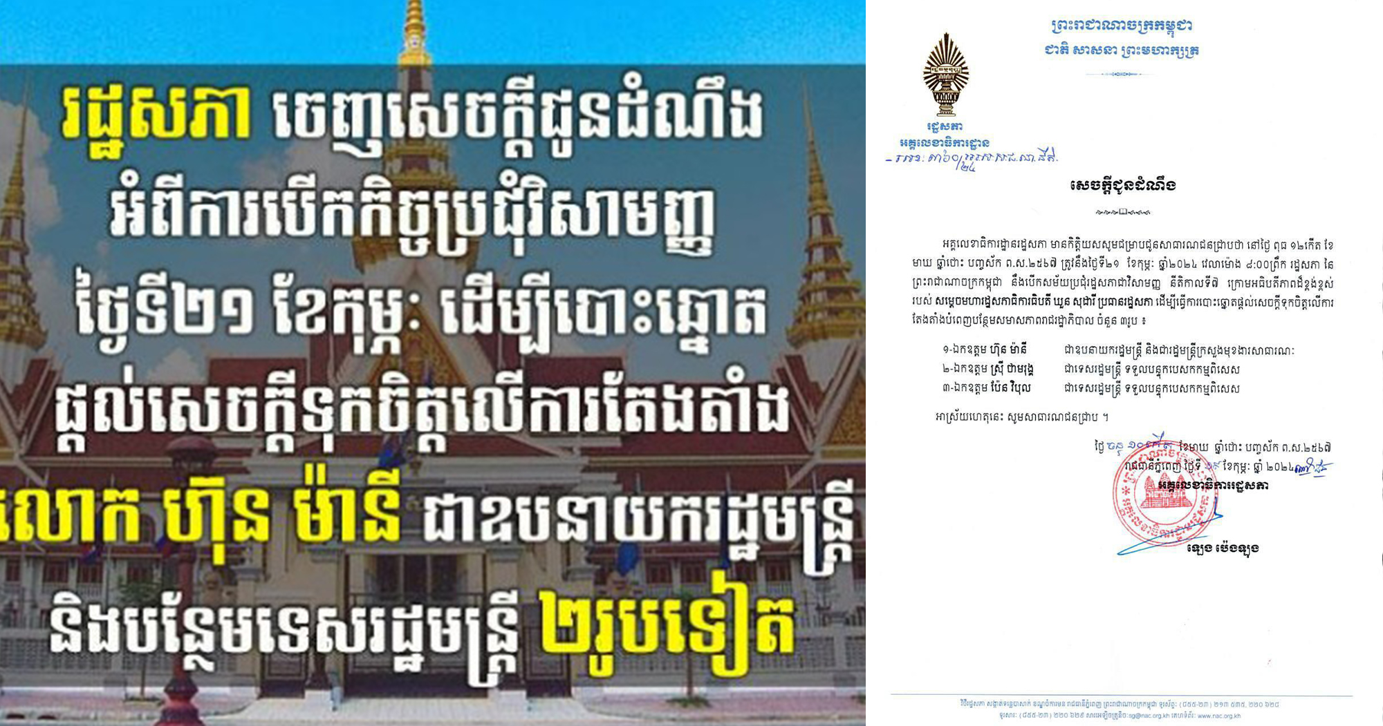 រដ្ឋសភា ចេញសេចក្តីជូនដំណឹង អំពីការបើកកិច្ចប្រជុំវិសាមញ្ញ ថ្ងៃទី២១ ខែកុម្ភៈ ដើម្បីបោះឆ្នោតផ្តល់សេចក្តីទុកចិត្តលើការតែងតាំង លោក ហ៊ុន ម៉ានី ជាឧបនាយករដ្ឋមន្រ្តី និងបន្ថែមទេសរដ្ឋមន្រ្តី២រូបទៀត