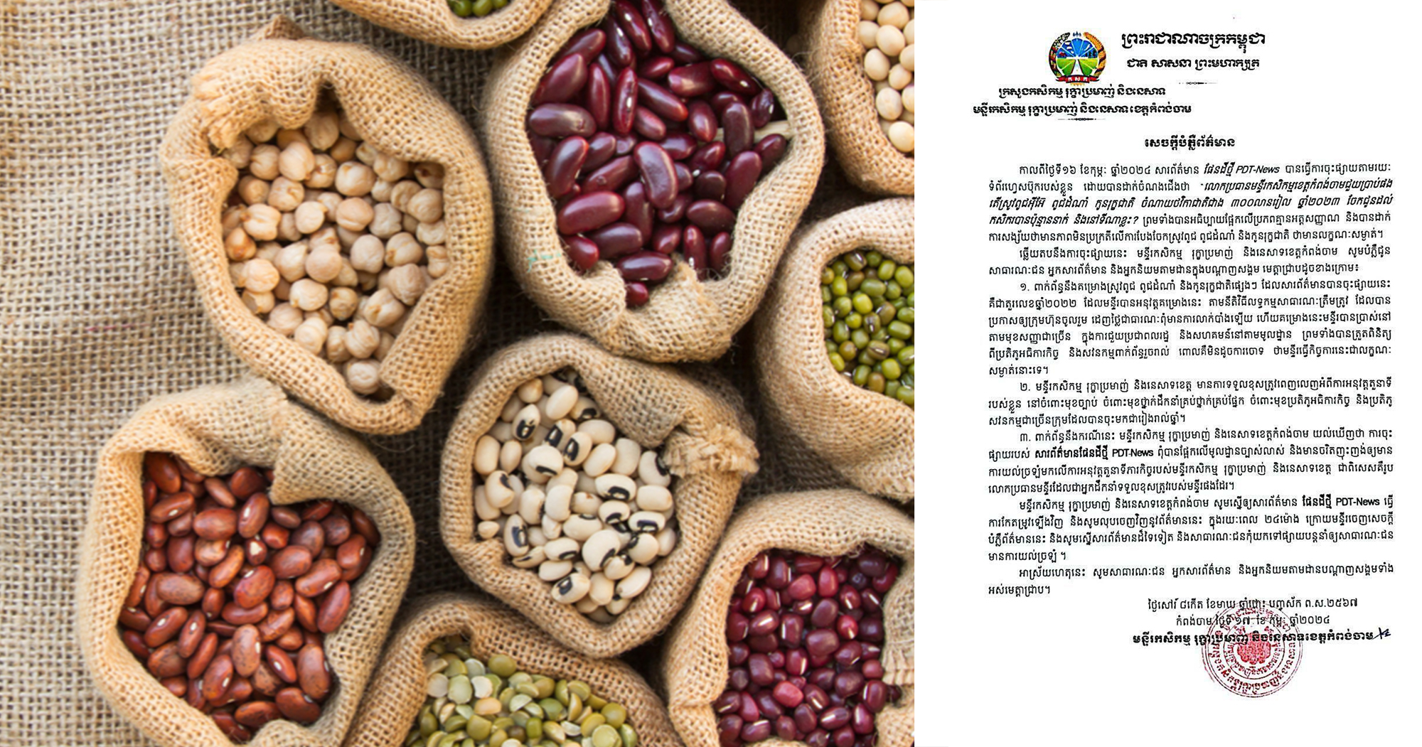 មន្ទីរកសិកម្មខេត្តកំពង់ចាម ចេញសេចក្ដីបំភ្លឺ ឆ្លើយតបសារព័ត៌មានក្នុងស្រុកមួយ ករណីការសង្ស័យលើការបែងចែកស្រូវពូជ ពូជដំណាំ និងកូនរុក្ខជាតិ ថាមានលក្ខណៈសំងាត់