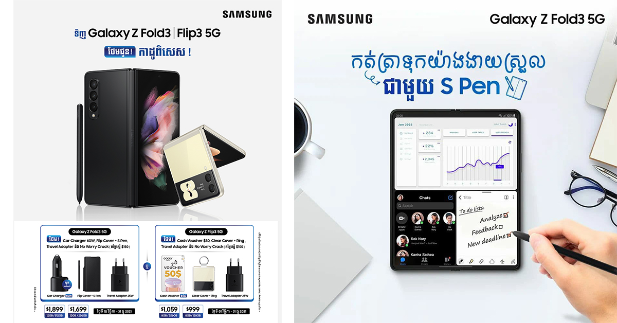 ចំណេញច្រើនជាងពេលណាៗទាំងអស់ ចាប់ពីថ្ងៃនេះ ដល់ថ្ងៃទី 14វិច្ឆិកា រាល់ការទិញ Galaxy Z Fold3 5G មួយគ្រឿង អ្នកនឹងទទួលបានទឹកប្រាក់ត្រឡប់ $30 ភ្លាមៗ ងាយៗ។ ឈប់សិន! មិនមែនតែ 30$ នេះទេ — ទឹកប្រាក់នេះ ជាការបន្ថែមលើប្រូម៉ូសិនដែលមានស្រាប់ ជាមួយការផ្ដល់ជូនយ៉ាងសន្ធឹកសន្ធាប់ដូចជា៖ – ឆ្នាំងសាកសម្រាប់ប្រើជាមួយរថយន្តល្បឿនលឿន (Car Charger Super-Fast Charge) កម្លាំង 60W ម៉ូឌែល (EP-L5300XBEGWW) ដែលមានតម្លៃ 49 $ មួយគ្រឿងភ្លាម…! – ឈុត Starter Kit មួយឈុតភ្លាម (Travel Adaptor 25W, Flip Cover, S-Pen Fold Edition) – No Worry Crack 150$ Wow! […]